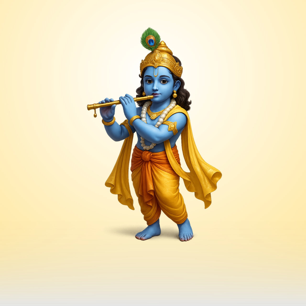 (peacock-feather crown) fell down, with a desire to get the touch of the lotus feet of Śrīmatī Rādhikā. His pita-vāsanā (yellow cloth) became loose and also began to fall down, and Kṛṣṇa Himself became faint and also fell down. In this śloka, Śrīla Prabodhānanda Sarasvatī Ṭhākura expresses the supremacy of Rādhikā. That very Kṛṣṇa, the Supreme Lord, whose sidelong glances attract all the gopīs and force them to faint, now drops His flute, His peacock feather, and His cādar, and becomes unconscious. Śrīla Prabodhānanda Sarasvatī Ṭhākura therefore prays, “When will I be fortunate enough to serve that Rādhikā’s lotus feet with rasa?”